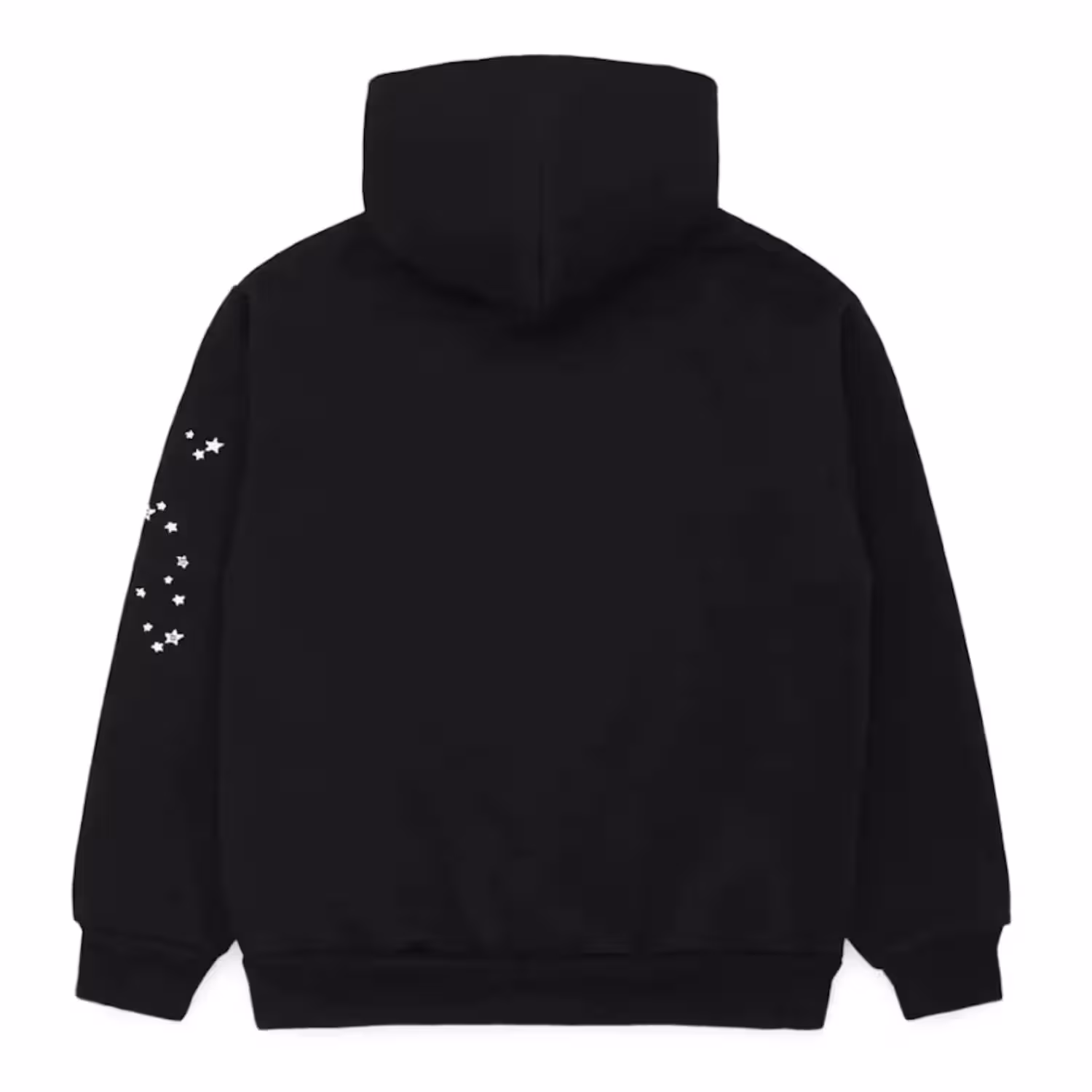 Small white stars also decorate the left sleeve, while the back of the hoodie maintains a clean, solid black finish.