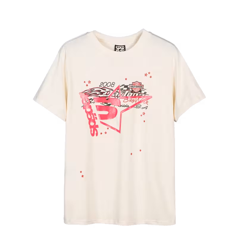The Sp5der T-Shirt Motocross Beige features dynamic racing-inspired prints across the chest and back, giving it an authentic motocross feel. The beige colorway adds versatility, making it easy to pair with cargos, denim, shorts, and street sneakers. Its relaxed fit provides an effortless silhouette that works for both men and women, perfect for casual streetwear, outdoor days, concerts, or laid-back layering.